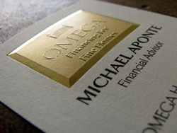 Nothing says "fancy" like foil stamping. Using foil in the design of your stationery, invitations, greeting cards or packaging will add a bit of gleam that will catch anyone's eye. Foil stamping creates a smooth opaque image for fine lines or large solids, and is a great way to create metallic effects.